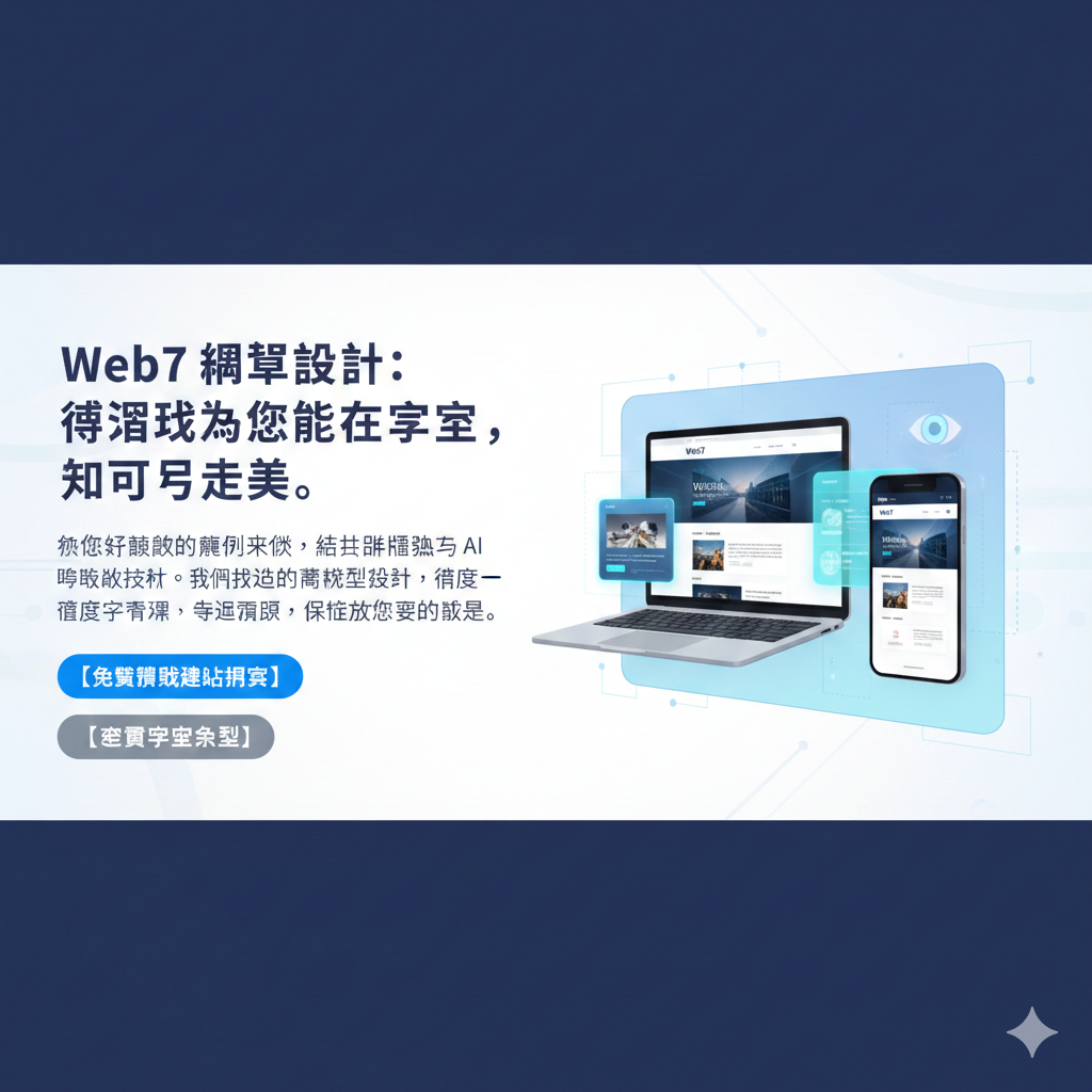 主標: Web7 網頁設計:讓網站為您帶來生意,而不只是美。 描述: 提供不踩雷的專業網頁設計服務。我們參考您欣賞的範例,結合品牌靈魂與 AI 曝光技術,打造能將訪客轉化為訂單的商機型網站。